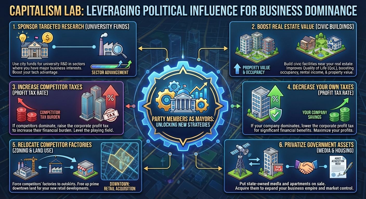 3) If your competitors have a large business presence in the city, increase the corporate profit tax rate to increase their tax burden.
