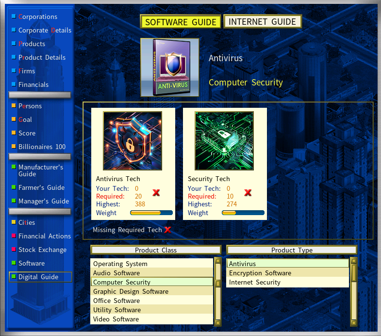The following screenshots show the various software product classes in the game and the software types within each class.