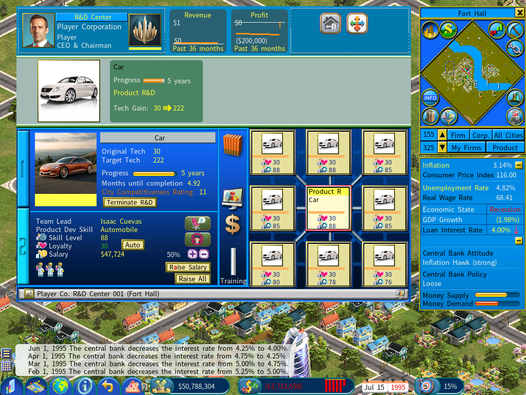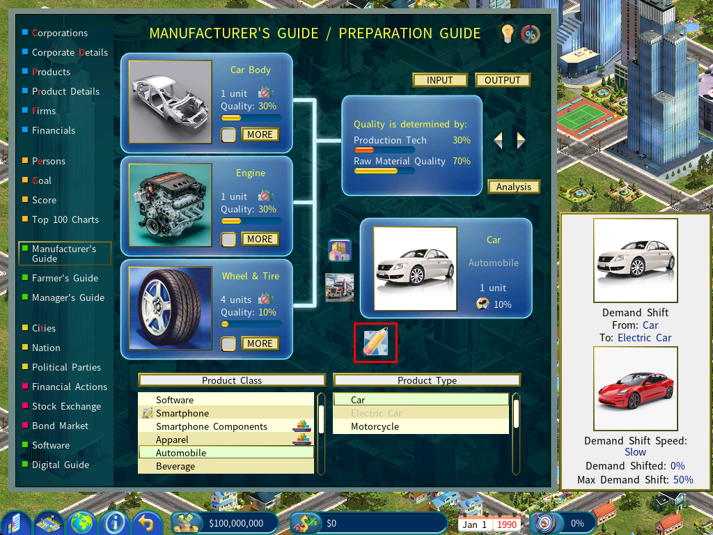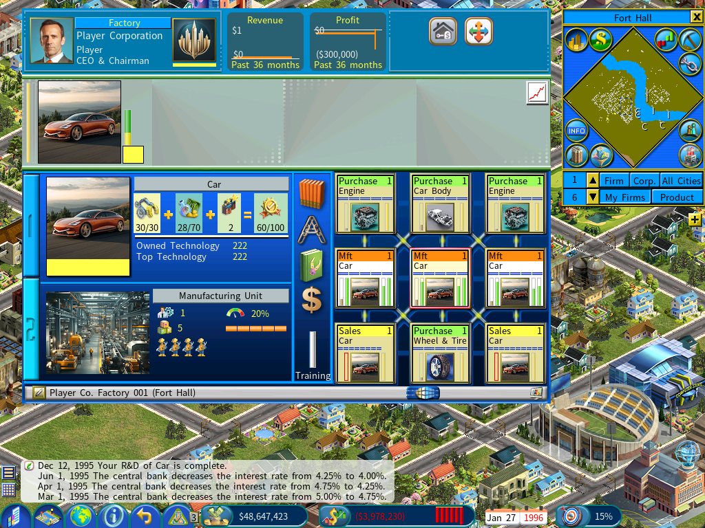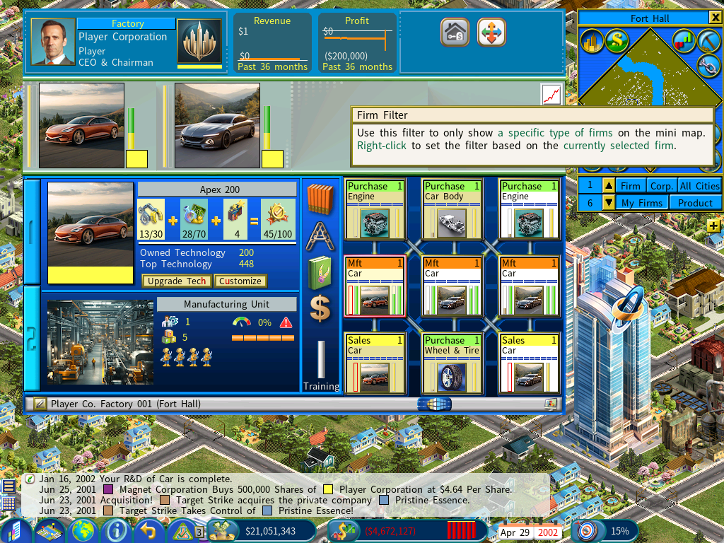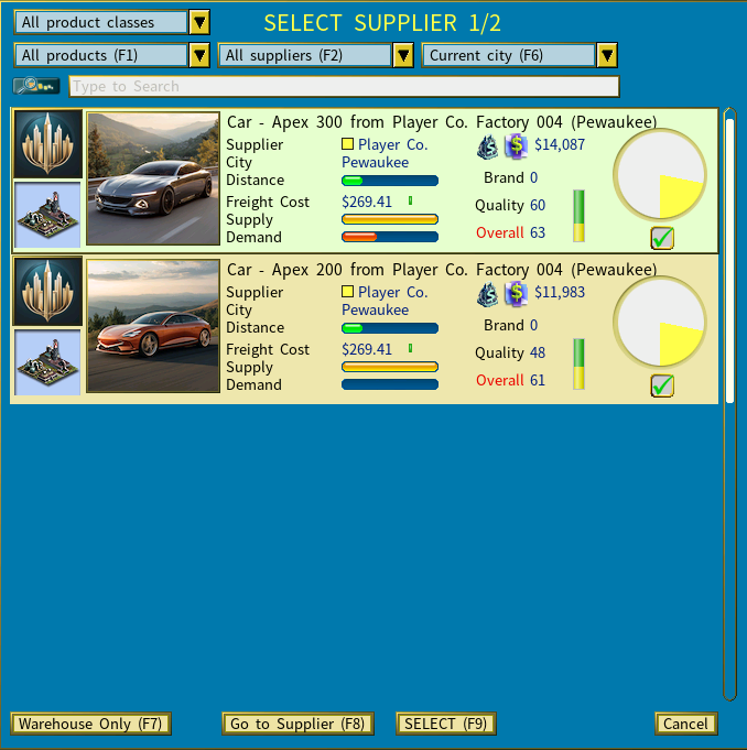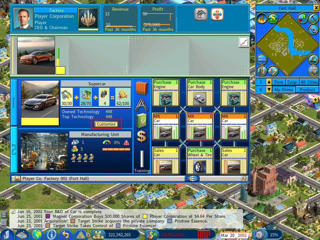 As illustrated in the below screenshot, the factory is currently producing Cars using a custom product image, thanks to the fact that the R&D effort has advanced the technology to a level that now exceeds the one you have defined on the Product Customization window (with a tech level of 200 in this example).